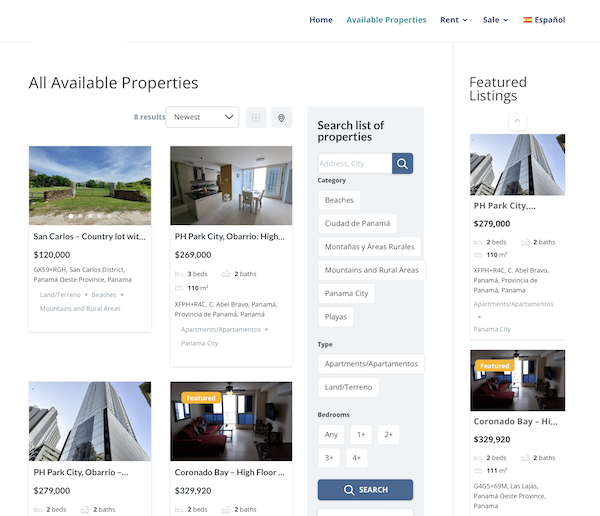 For this website, high-resolution images were added, a property database was installed, and pages are available in both English and Spanish.